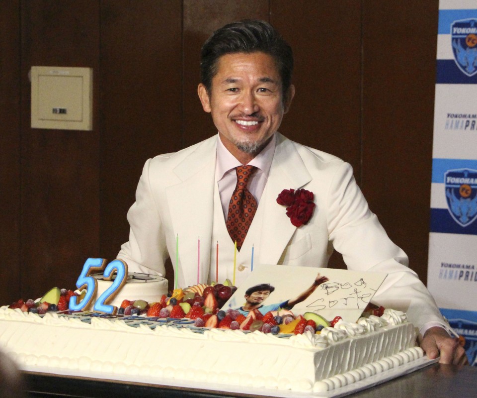 The sports portion of today’s Japanese news showcased the celebration of Kazu Miura’s 52nd birthday. Looking as dapper as ever in a fashionable white suit in front of a huge cake, he shared that every birthday he wore a different color suit (past years have included bright red, yellow and blue), but that he had run out of colors so had to return to white. Perhaps it is this enthusiasm and youthful spirit that enables him to keep pace on the soccer field with professional players decades his junior. Miura (a.k.a. “King Kazu”) began his career in 1986, and he is considered to be Japan’s first soccer superstar.