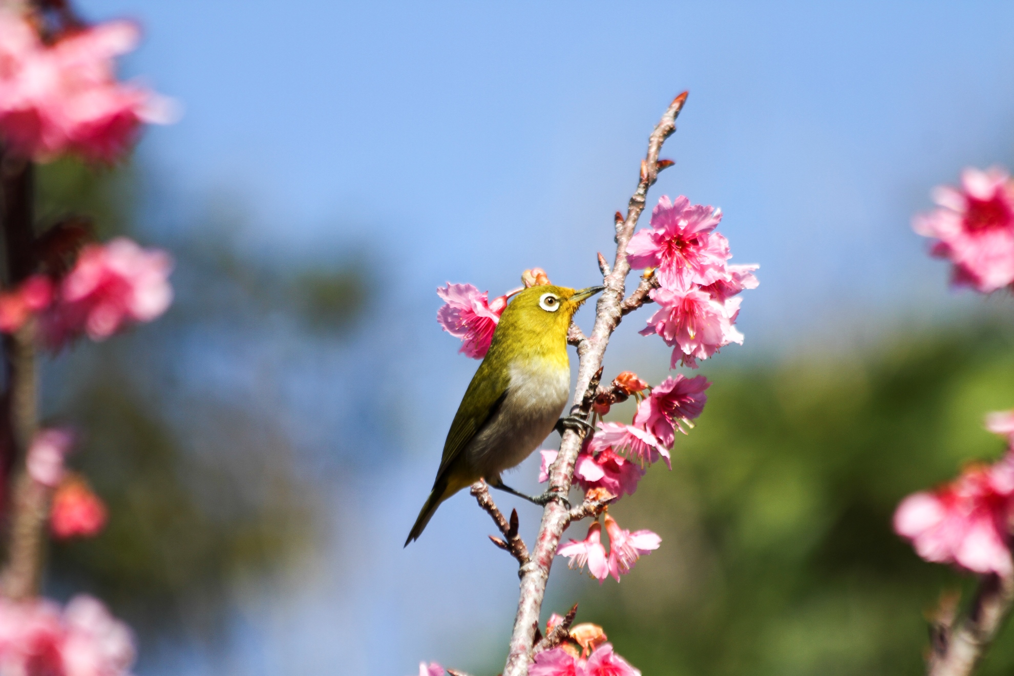 January 26th marked the beginning of the 2013 Kumejima Sakura Festival. Sakura (Cherry Blossoms) are an important symbol marking the change of seasons in Japan. As the weather begins to warm, cherry trees sprout beautiful flowers in a range of colors from white to red. Since Okinawa is so far south, cherry blossoms begin to arrive in January. They work their way north through April. During this time, people flock to areas with cherry trees to picnic, drive, and see the beautiful flowers and wildlife.You might have noticed the new header, a compilation of 3 shots taken of a Mejiro (Japanese white-eye) in cherry trees I caught the Friday before the festival along the Ara Forest path.
